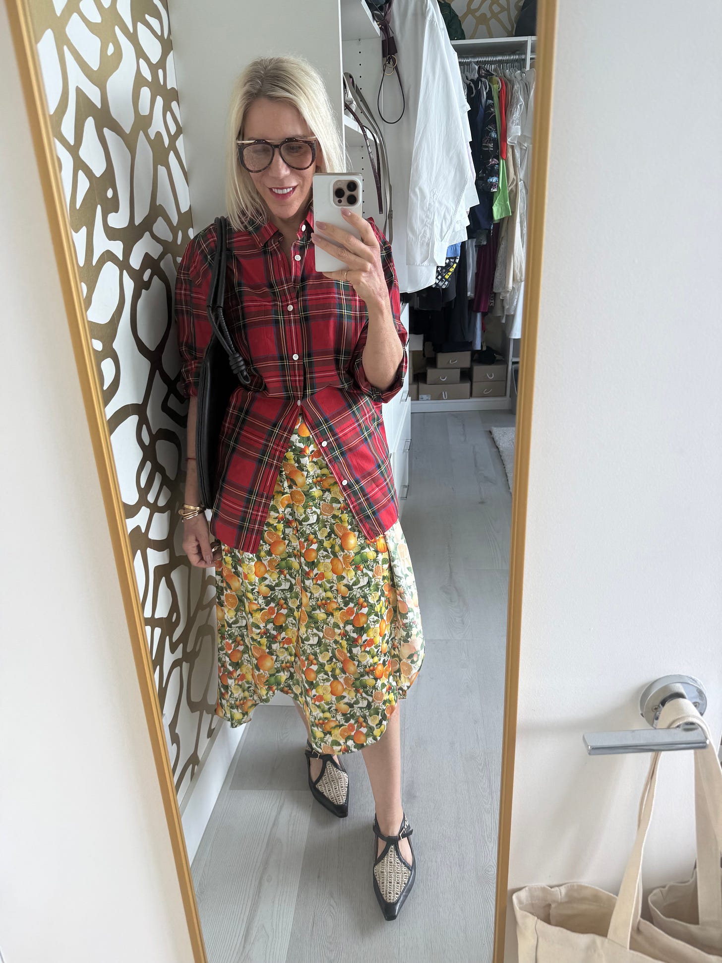 Play with the amount and placement of each print. This time around I saw the impact of how much each printed piece of clothing shows when you put the outfit together. When I had a red plaid shirt completely tucked into a fruit print skirt completely, the line was too sharp, and it showed too much of the daintier fruited pattern, when the masculine plaid is more “me.” I played with a different treatment of the tuck to show more of the red plaid and bring more of it down into the lower half of the outfit.