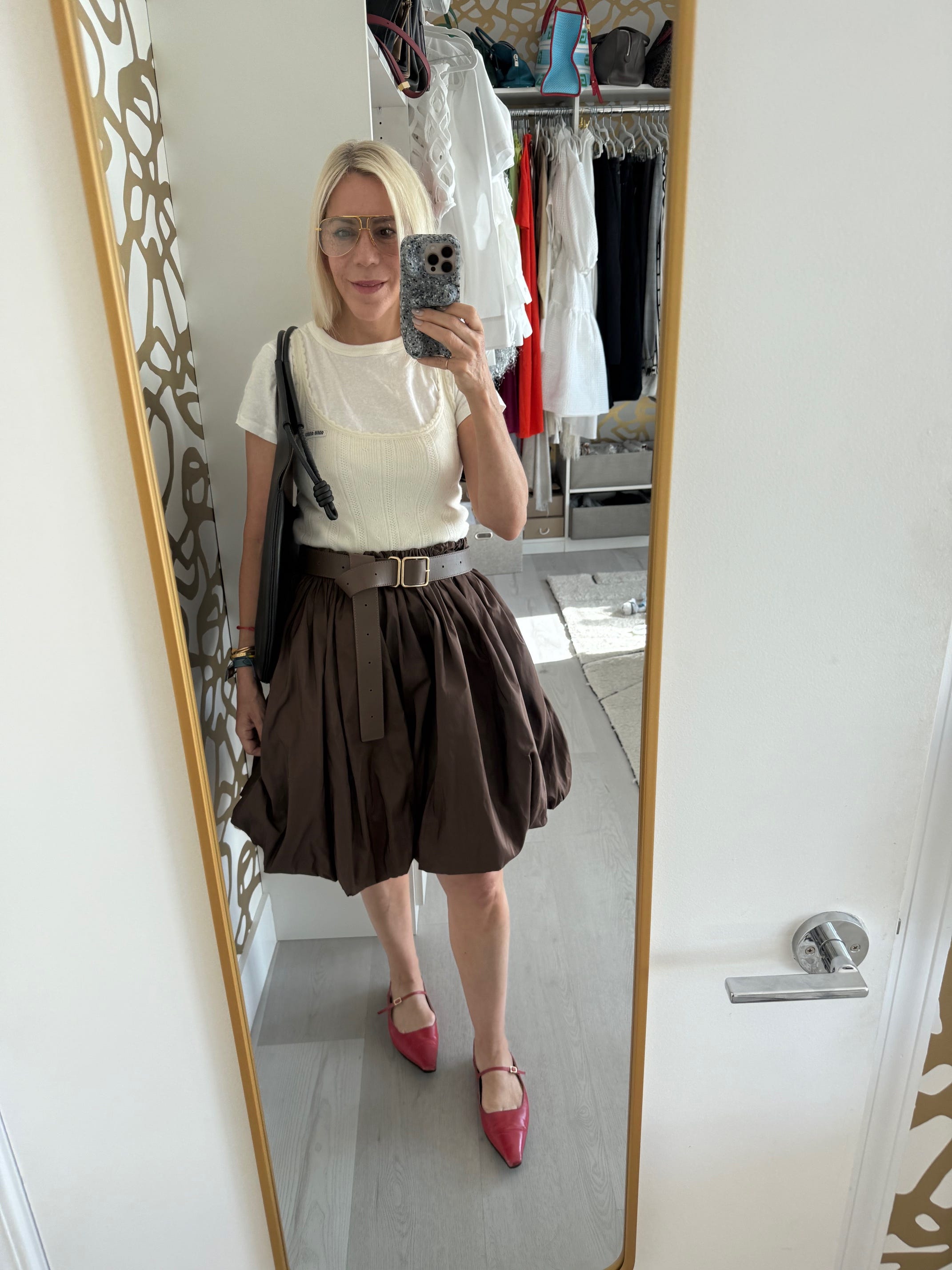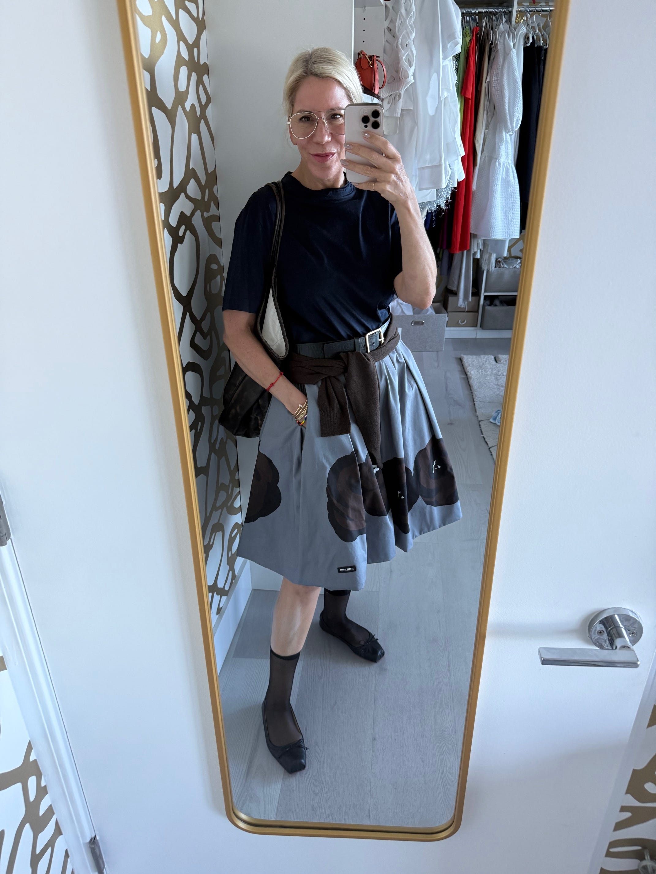 Why: Workday for Honor Code - I think about something I won’t have to fuss with. Same idea as the look above, but this worked so much better. The elastic on this skirt, made by a Miami independent designer (who became a friend!), is much better, much more comfortable. Putting the same color belt a little below the top of the waist is a short waist hack. So is the light color layering on top - gives more heft to my upper section.