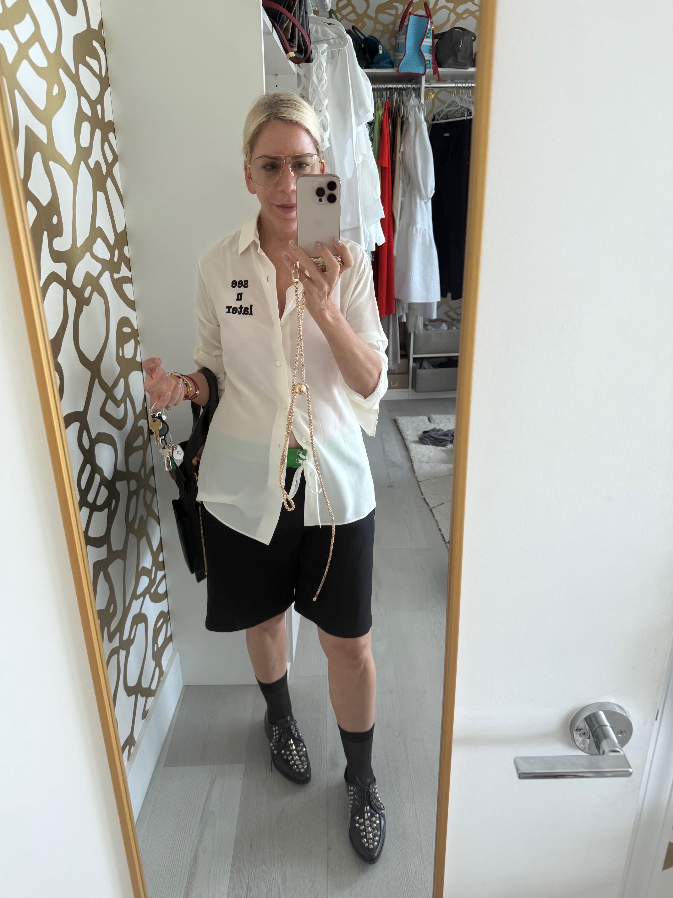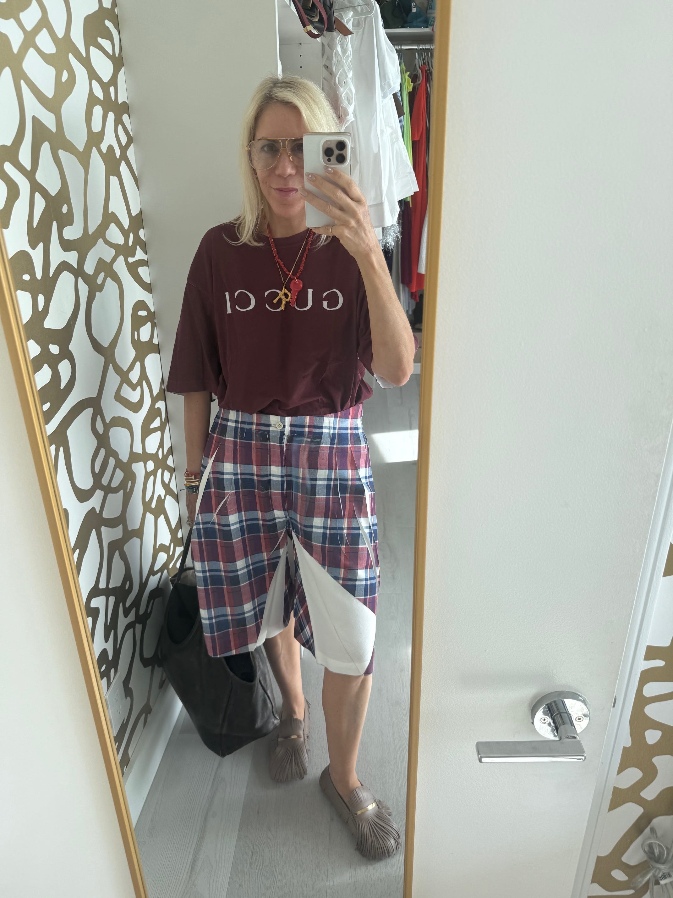Why: The Go Big theory. We went to Jupiter + Palm Beach or the day to be with family. Palm Beach is preppy, and what I do when encountering a situation that’s not exactly me (preppy, Mainer, garden party) is to go even bigger on those ideas. Then it feels like a wink, and THAT feels like me. So the Gucci on the tee and the plaid short and the gold letter and the moccasin — that ALL made it playful. Adding the key, in which you feel the evidence of hand makes it so personal.