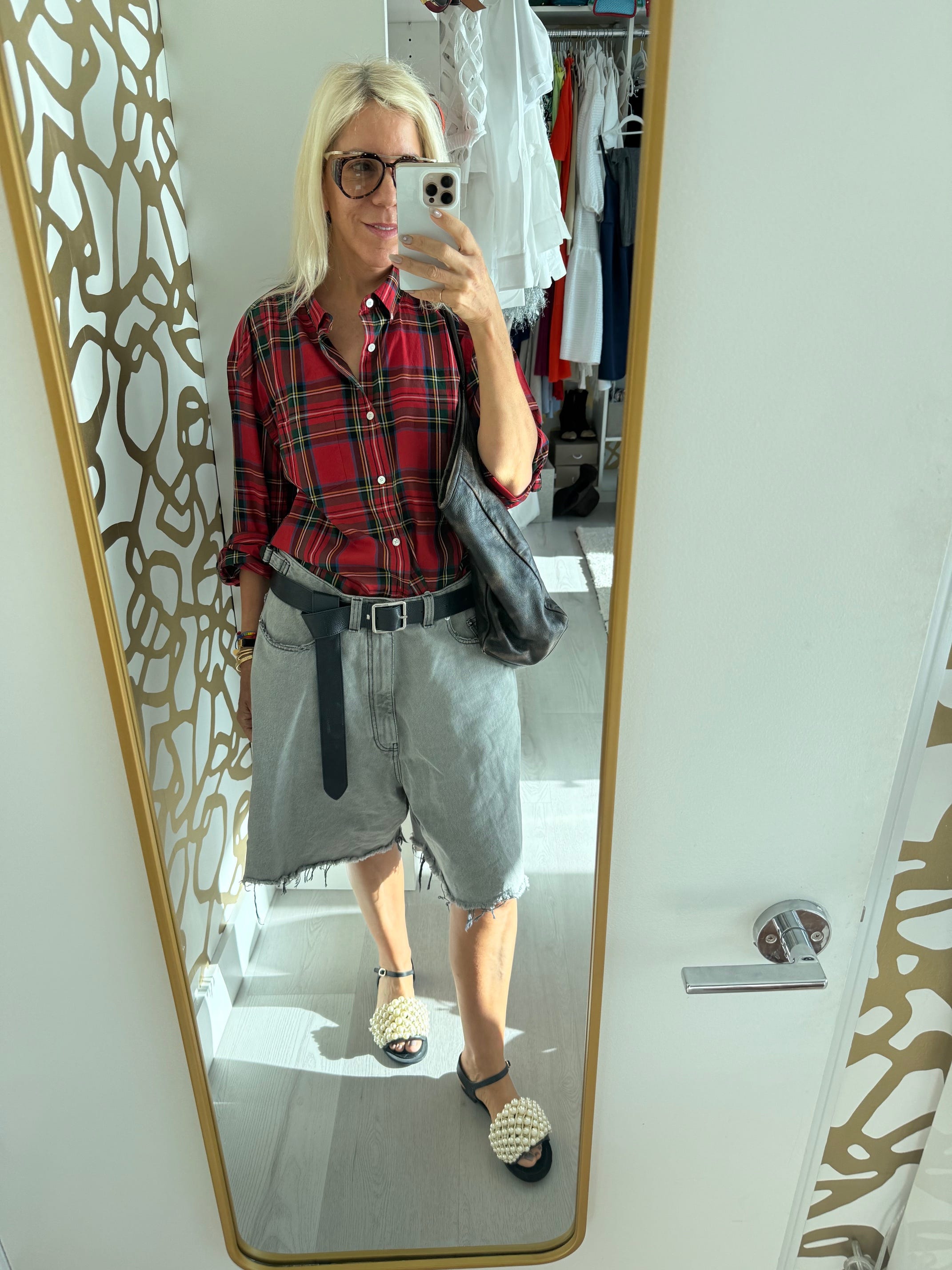 Secondhand men’s Burberry shirt (similar and this would work - great new option) and Balenciaga gray denim shorts; both from Veblen (these shorts look great + are on sale, haven’t bought the brand)